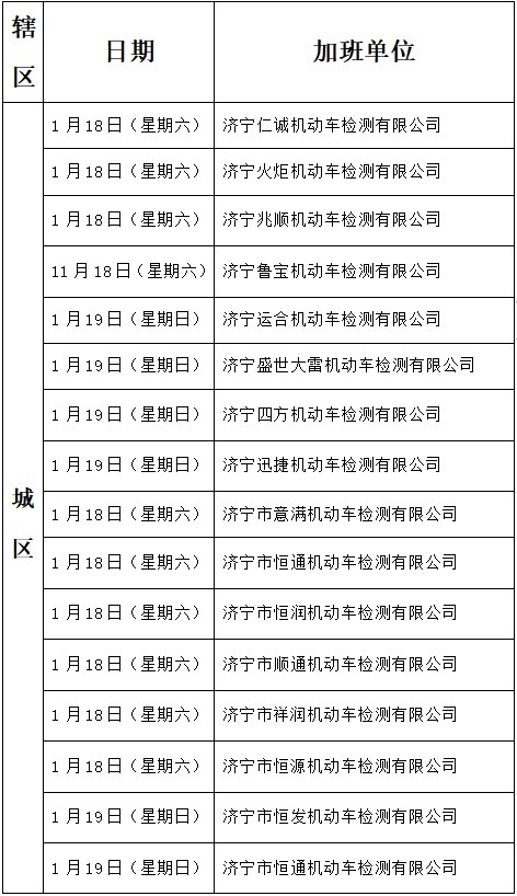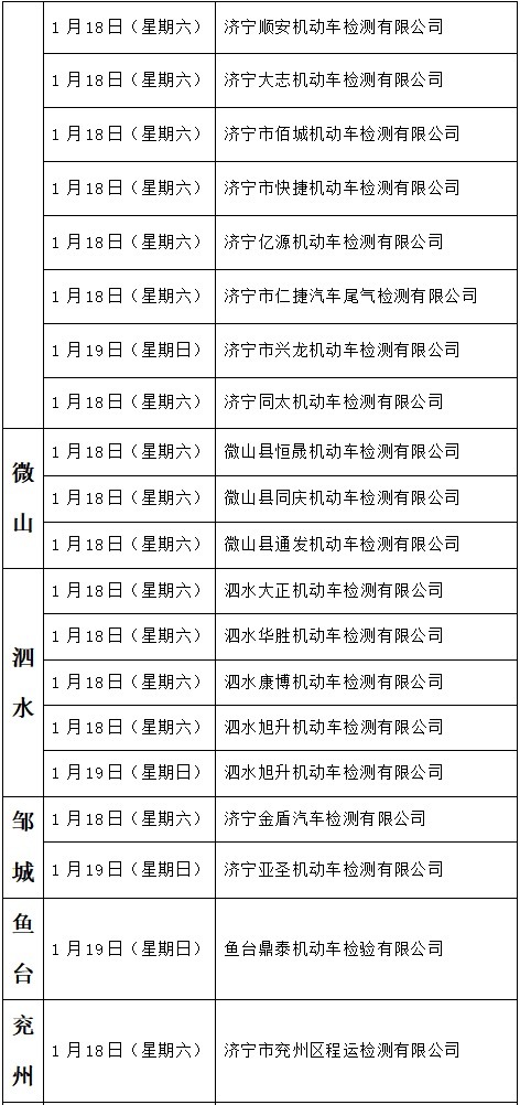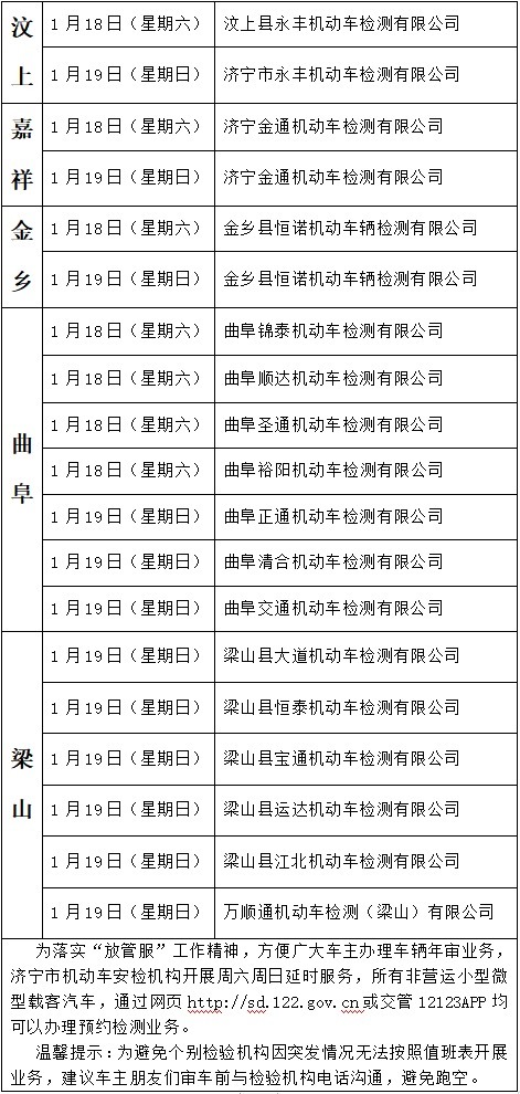 1月17日,济宁车管所发布全市机动车检验机构周末延时服务一览表。济宁市机动车安检机构开展周六、周日延时服务,方便广大车主办理车辆年审业务,所有非营运小型微型载客汽车,通过网页http://sd.122.gov.cn或交管12123APP均可以办理预约检测业务。